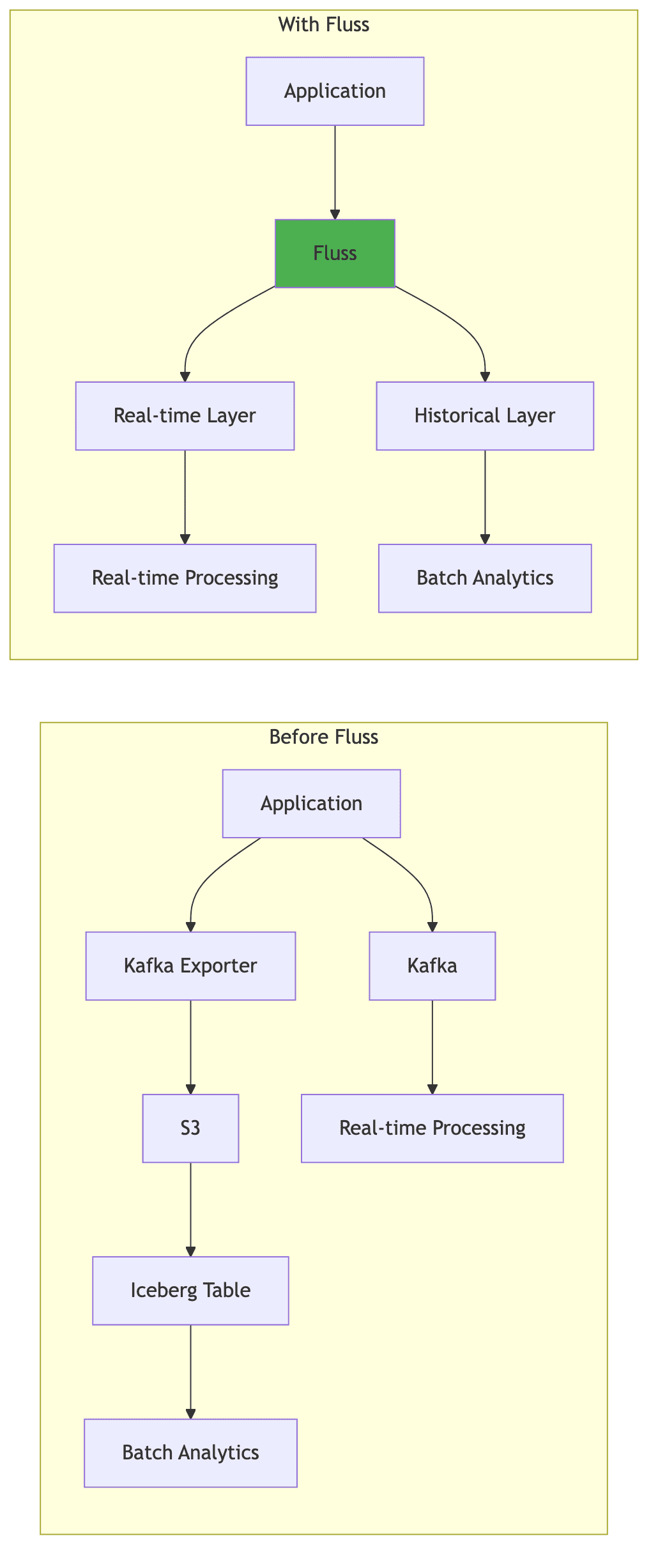 | Schema evolution | Fluss unified metadata | Single schema for stream + batch | Coupled architecture | Frequent schema changes |