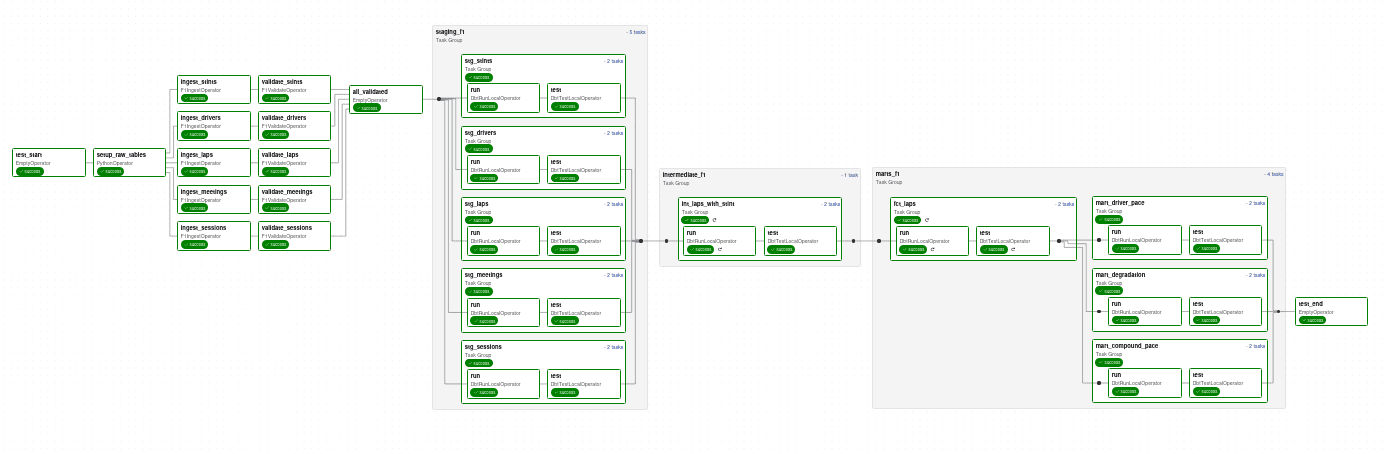 intermediateandmart: These tasks are alsoTaskGroups that run the intermediate and mart models. The intermediate models join the laps and stints data to create a more comprehensive view of the drivers' performance in each session. The mart models create aggregated tables for different metrics relevant to the race analysis.