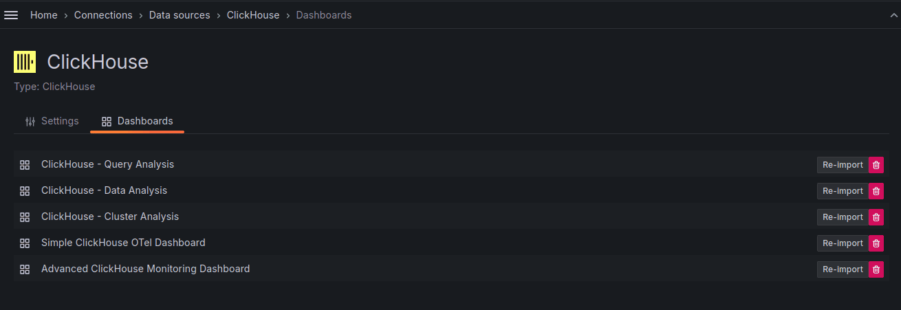 I haven't added the clickhouse metrics, but if you want to add them, go to Menu > Administation > Plugins and data > Plugins and add the Clickhouse plugin from Grafana Labs. Next, go to Menu > Data sources and add a new data source for Clickhouse. In the Dashboard tab for that data source, you can import the various Clickhouse dashboards from Grafana Labs.