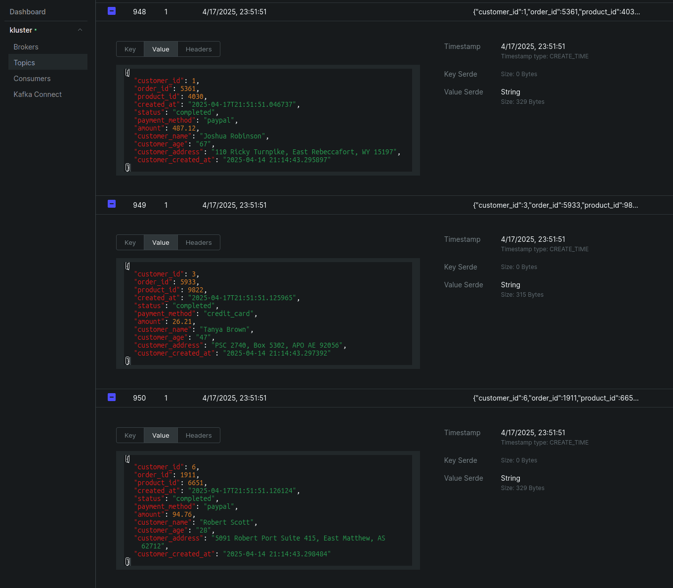 You can also check the enriched-customer-orders topic to see the enriched orders using the Kafka UI.