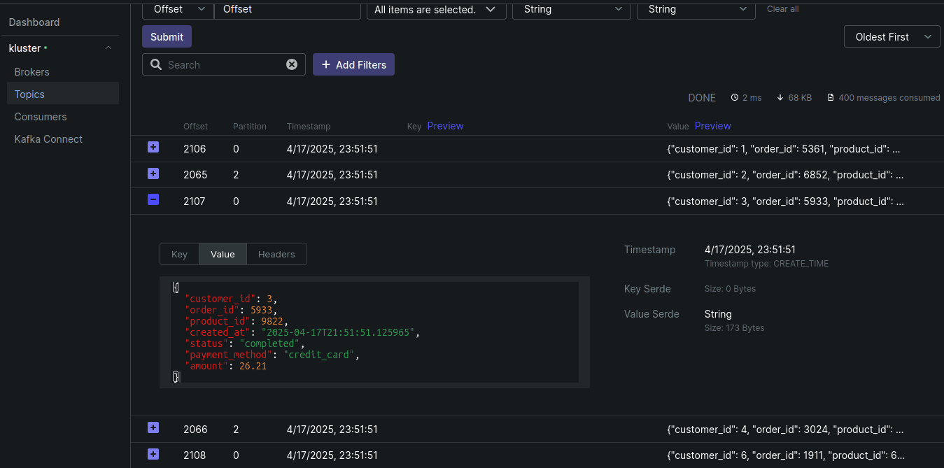 After the job executes, you should see the messages in the orders topic. If you've followed along from the previous post, I provide manifests to deploy a Kafka UI to visualize the messages in the topic.