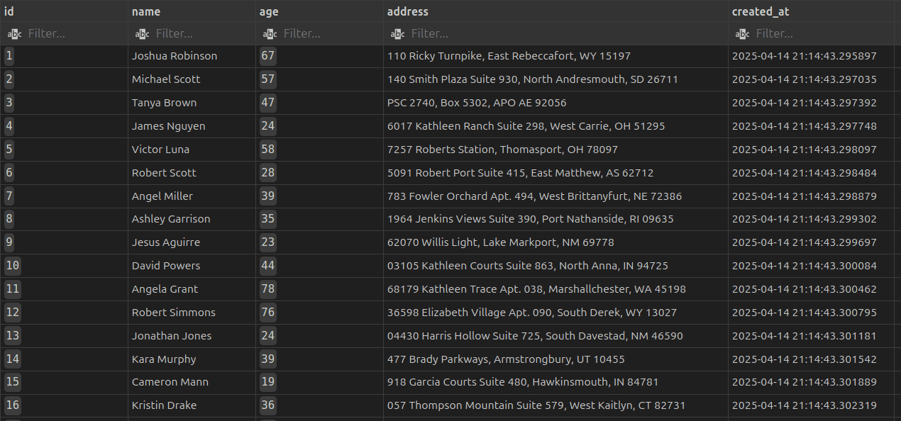 1 def generate_and_insert_data(self, num_records: int): 2 try: 3 self.cursor.execute( 4 f"TRUNCATE TABLE {self.schema}.customers RESTART IDENTITY;" 5 ) 6 self.conn.commit() 7 8 insert_query = f""" 9 INSERT INTO {self.schema}.customers (name, age, address, created_at) 10 VALUES (%s, %s, %s, %s) 11 """ 12 13 for i in range(1, num_records + 1): 14 name = self.faker.name() 15 age = self.faker.random_int(min=18, max=80) 16 address = self.faker.address().replace("\n", ", ") 17 created_at = datetime.now() 18 self.cursor.execute(insert_query, (name, age, address, created_at)) 19 20 if i % 100 == 0 or i == num_records: 21 self.conn.commit() 22 self.logger.info(f"Inserted {i} records into the database.") 23 24 self.logger.info("All records inserted successfully.") 25 except Exception as e: 26 self.logger.error(f"Error inserting data: {e}") 27 self.conn.rollback() 28 raise 29