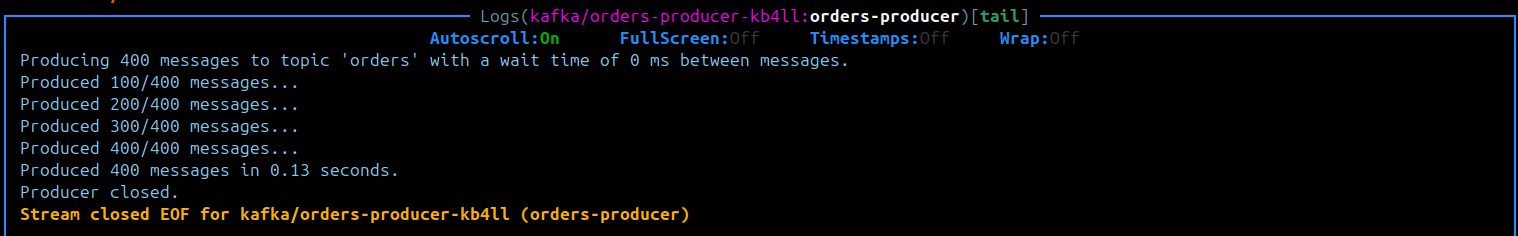 1apiVersion: batch/v1 2kind: Job 3metadata: 4 name: orders-producer 5 labels: 6 app: orders-producer 7spec: 8 template: 9 metadata: 10 labels: 11 app: orders-producer 12 spec: 13 containers: 14 - name: orders-producer 15 image: abyssnlp/orders-producer:0.1 16 imagePullPolicy: IfNotPresent 17 restartPolicy: Never 18 backoffLimit: 0 19